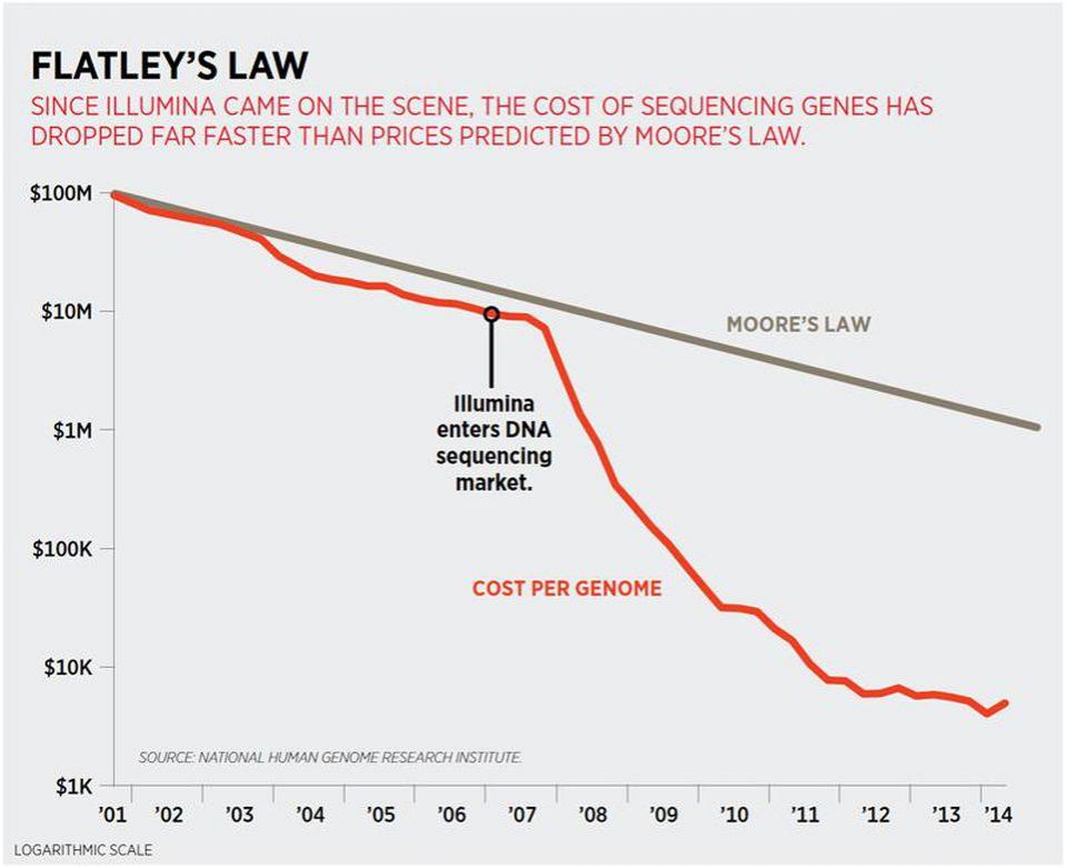 The first DNA sequencing experiments used a laborious chromatography technique. It became much faster and easier after the development and commercialization of fluorescence based approaches. This has resulted in scientists making huge strides in understanding DNA and developed several ground breaking applications. The greatest achievement enabled by this technique is however, the 15 year project that deciphered the human genome (the set of instructions that defines the human organism). This resulted in huge investments in developing techniques that increase the speed and decrease cost of sequencing. Over the past decade or so this cost dropped from $100 million per human genome to only $1,000 which is faster than that affected by Moore’s law and this is popularly called as Flateley’s law after its then Chief Executive Jay Flateley of Illumina. Inc. which was the driving force behind this revolution.