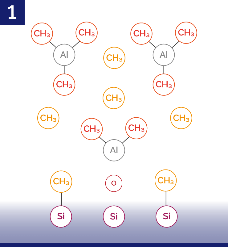 Step 1) Dosing of the substrate with a precursor vapour of TMA, which adsorbs on and reacts with the surface. With the correct choice of precursor and parameters, this reaction is self-limiting.