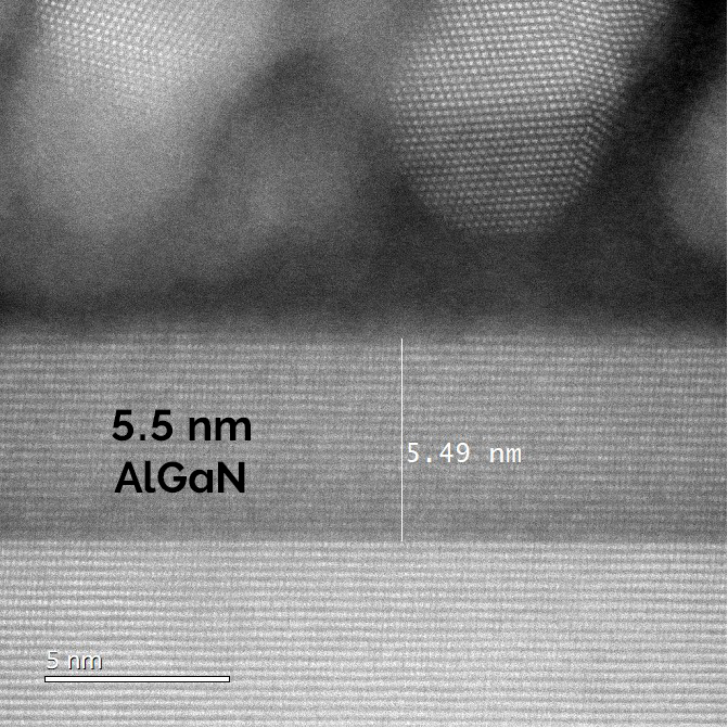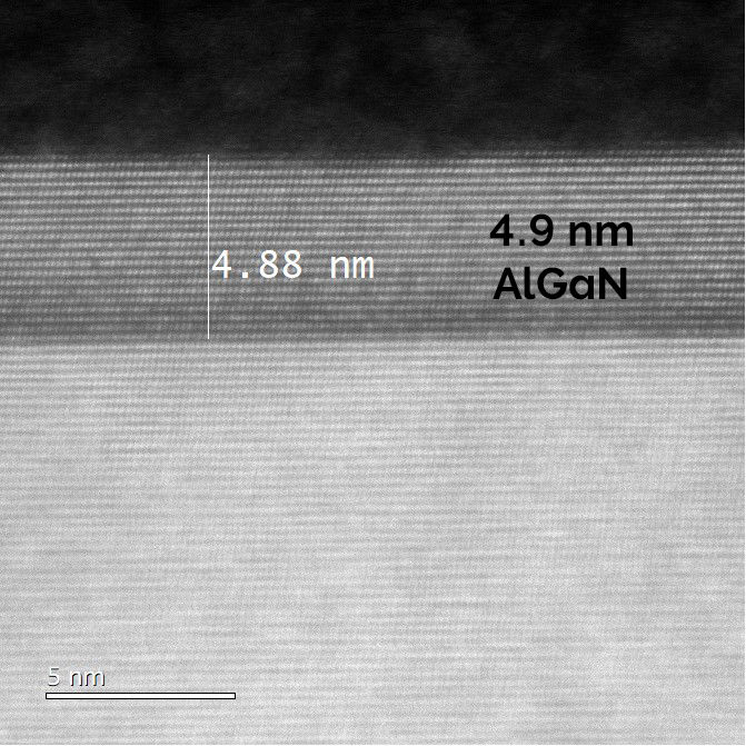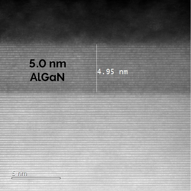 Figure caption: TEM verification across 3 samples of Etchpoint accuracy for AlGaN layer. Targeted AlGaN remaining thickness after ALE of 5 nm ±0.5 nm achieved, which was correlated to Etchpoint etch traces.