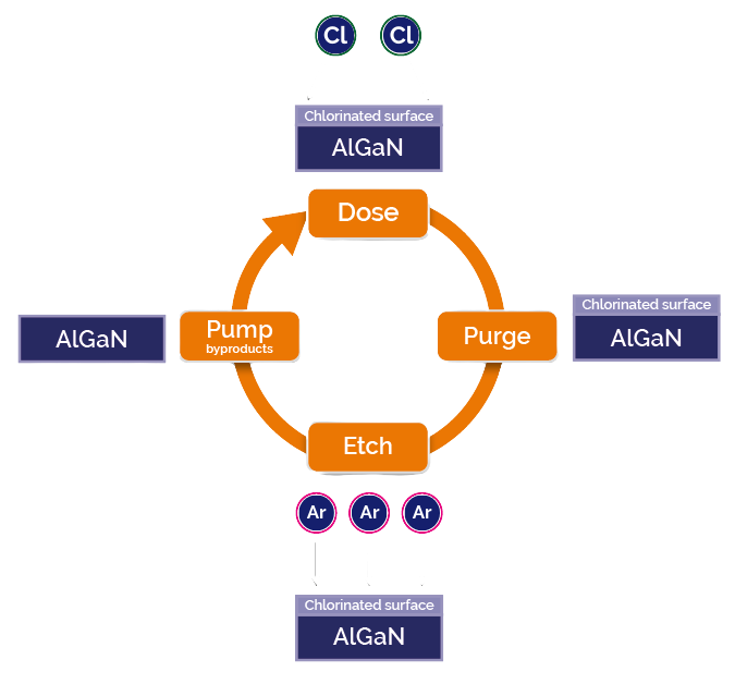 ALE typically involves a cycle of 4 steps that is repeated as many times as necessary to achieve the required etch depth. This example shows ALE of AlGaN etching with Cl2/Ar.