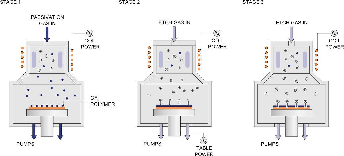 The Bosch process uses a fluorine based plasma chemistry to etch the silicon, combined with a fluorocarbon plasma process to provide sidewall passivation and improved selectivity to etch mask. A complete etch process cycles between etch and deposition steps many times to achieve deep, vertical etch profiles. It relies on the source gases being broken down in a high-density plasma region before reaching the wafer.