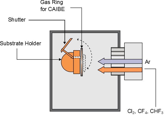 In Reactive Ion Beam Etching (RIBE) and Chemically Assisted Ion Beam Etching (CAIBE) modes, reactive species are added (CHF3, SF6, N2, O2, etc.) to the source (RIBE) or to the gas ring (CAIBE) to increase volatility of etch products and selectivity to the mask material.