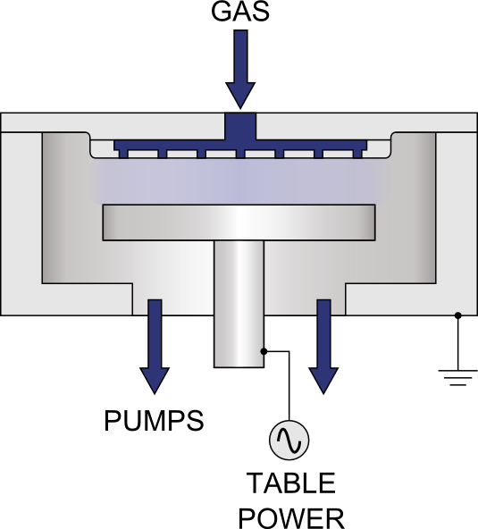 Reactive Ion Etch (RIE) is a predominantly physical etch process. A rich plasma is created just above the wafer and the ions are accelerated toward the surface to produce a powerful and highly anisotropic etch. Gas enters the top of the chamber where it is converted into a reactive plasma at low pressure by a wafer-level RF source. The ions either interact with the sample to form etch by-products, or remain as unreacted species. All the unreacted species and by-products are removed from the chamber by the vacuum pump to maintain a rich and active plasma to maintain high etch rates.